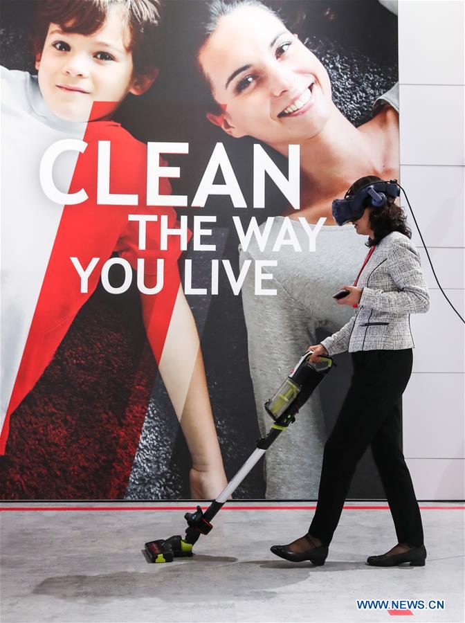A visitor tries a vacuum cleaner with a VR device at the booth of Hoover during the 2019 IFA fair in Berlin, capital of Germany, on Sept. 6, 2019. The 59th Consumer Electronics Unlimited (IFA) fair, Europe's biggest consumer electronics show, opened in Berlin on Friday, with the latest products and innovations from the leading global brands. (Xinhua/Shan Yuqi)