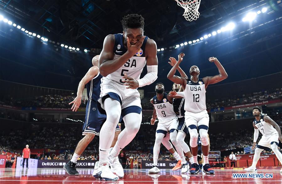 Donovan Mitchell (front) of the United States covers his mouth during the group K match between the United States and Greece at the 2019 FIBA World Cup in Shenzhen, south China's Guangdong Province, Sept. 7, 2019. (Xinhua/Xu Chang)