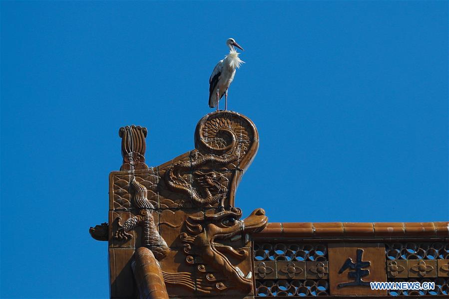 A white stork stands on the flying eave of a Chinese-style building in Pairi Daiza, a zoo in Brugelette, Belgium, Aug. 24, 2019. The Pairi Daiza zoo is a privately owned zoo and botanical garden, which houses more than 7,000 animals from around the world. (Xinhua/Zheng Huansong)