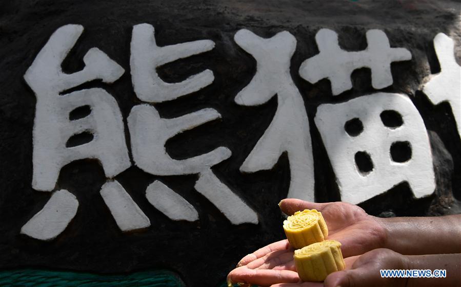 A staff member displays mooncakes made for giant pandas at the Hainan Tropical Wildlife Park and Botanical Garden in Haikou, south China's Hainan Province, Sept. 12, 2019. The moon cakes were specially made by the staff of Hainan Tropical Wildlife Park and Botanical Garden for giant pandas "Gonggong" and "Shunshun" to greet the upcoming Mid-Autumn Festival, which falls on Sept. 13 this year. (Xinhua/Yang Guanyu)