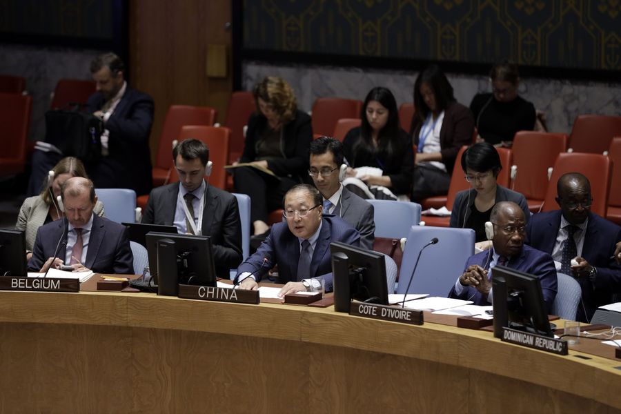 Zhang Jun (C, front), China's permanent representative to the United Nations, addresses a Security Council meeting on the situation in Afghanistan at the UN headquarters in New York on Sept. 10, 2019. (Xinhua/Li Muzi)