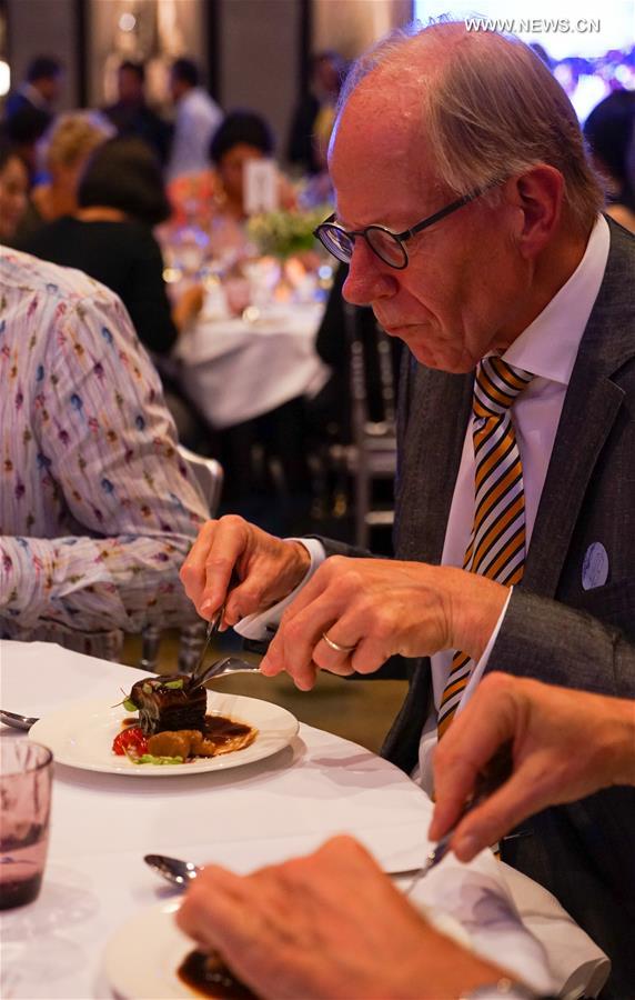A guest enjoys Huaiyang dishes at the "Huaiyang Cuisine Week" in The Hague, the Netherlands, Sept. 13, 2019. A series of events including a tourism seminar, a photo exhibition and a Huaiyang Cuisine Week activity were held during the Jiangsu Cultural and Tourism Carnival. The carnival, held from Sept. 7 to 19 in the Netherlands, aims to encourage more foreign tourists to visit China's eastern coastal province of Jiangsu. (Xinhua/Lin Liping)