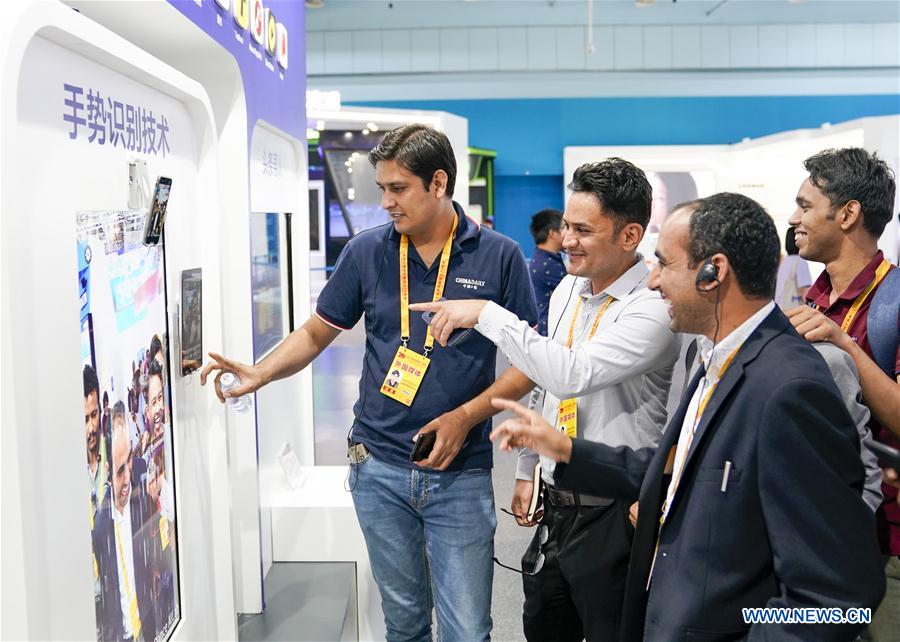 Journalists experience gesture recognition technology during a visit to the Innovation Achievement Exhibition in Zhongguancun National Innovative Demonstration Zone in Beijing, capital of China, Sept. 26, 2019. More than 60 journalists from 36 countries and regions on Thursday visited the exhibition. (Xinhua/Liu Chan)