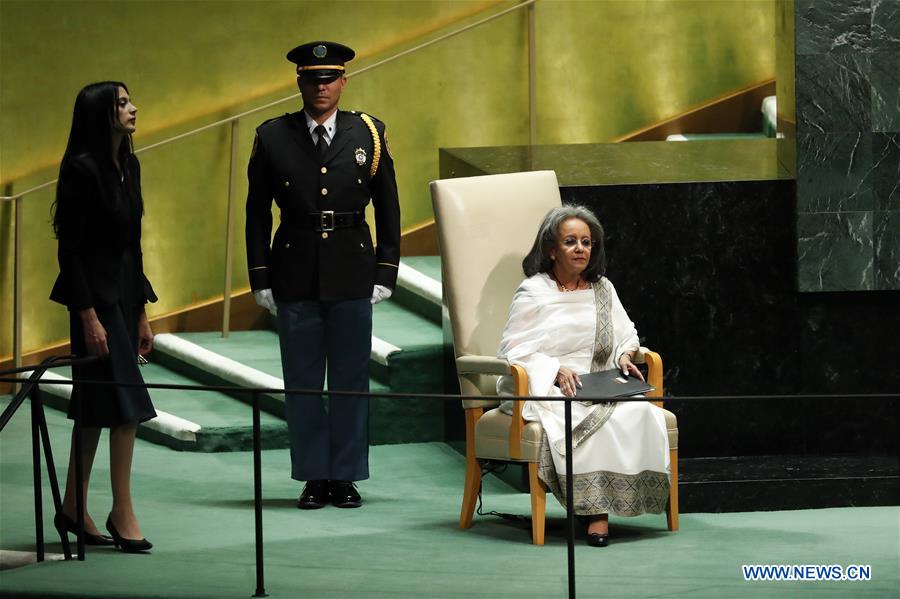 ?Ethiopian President Sahle-Work Zewde (R) waits to address the General Debate of the 74th session of the UN General Assembly at the UN headquarters in New York, on Sept. 26, 2019. (Xinhua/Li Muzi)