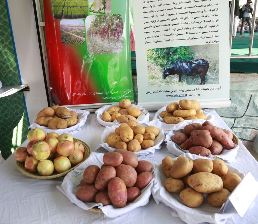 Agricultural products are displayed in the kiosks at the Agricultural Fair in Kabul, capital of Afghanistan, Oct. 16, 2019. (Xinhua/Rahmatullah Alizadah)