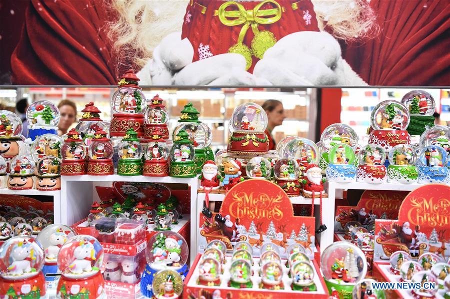 Photo taken on Oct. 23, 2019 shows Christmas ornaments during the 126th China Import and Export Fair, also known as the Canton Fair, in Guangzhou, capital of south China's Guangdong Province. The fair features three phases. The second, from Oct. 23 to 27, will show consumer goods, decorations and gifts. (Xinhua/Deng Hua)