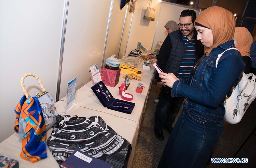 A visitor takes photos of cultural products on display during a Sino-Egyptian dialogue on cultural and creative industries in Cairo, capital of Egypt, Oct. 26, 2019. The Chinese Cultural Center in Cairo held late Saturday a Sino-Egyptian dialogue on cultural and creative industries, which was largely attended by the Egyptian audience. The event is part of "Experiencing Beijing," a series of activities organized by the Chinese Cultural Center in Cairo, which aims to introduce the Chinese capital to the Egyptian public. (Xinhua/Wu Huiwo)