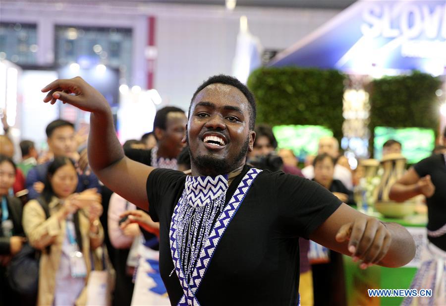 A performer dances at the Rwanda pavilion during the second China International Import Expo (CIIE) in Shanghai, east China, Nov. 6, 2019. (Xinhua/Zhang Chuanqi)