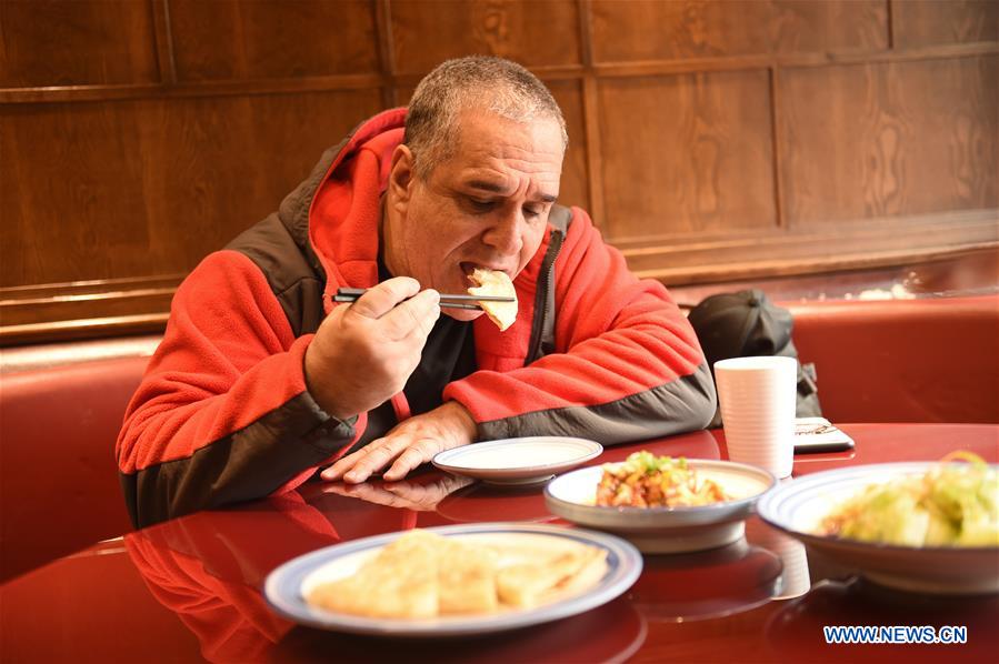 Ruy Menezes has lunch at a restaurant in Beijing, China, on Nov. 6, 2019. Ruy Menezes is a 54-year-old Brazilian Jiu-Jitsu coach from Rio de Janeiro. He got black belt from Carlson Gracie Junior, who is the grandson of Brazilian Jiu-Jitsu master Carlos Gracie. Ruy came to China for the first time in 2003. In 2009, Ruy began to teach Jiu-Jitsu at a club in Beijing. Four Chinese players got black belts under the instruction from Ruy. At present, Ruy settles in Beijing city and get used to the daily life here. "I won't teach Brazilian Jiu-Jitsu any more if I leave Beijing, because my team and my life are here." He said. (Xinhua/Chen Zhonghao)