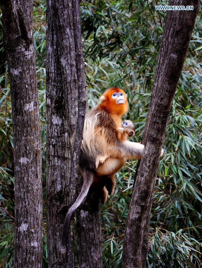 Golden monkeys look around at a valley in Foping County, northwest China's Shaanxi Province, Aug. 3, 2018. The Qinling Mountains, a natural boundary between the country's north and south, are home to a huge variety of plants and wild animals such as giant pandas, golden monkeys, crested ibis and takins. (Xinhua/Liu Xiao)