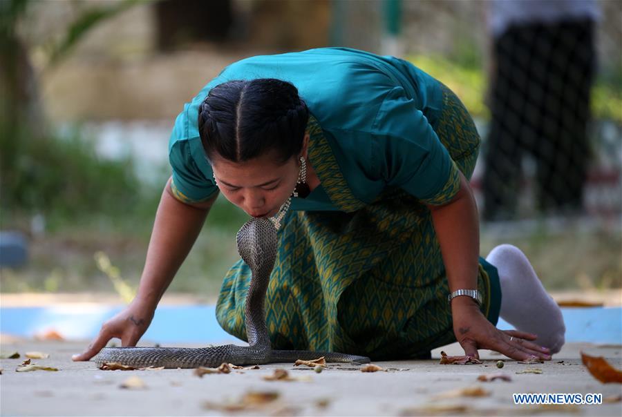 A female performer kisses a snake during the animal talent show at the Zoological Gardens in Yangon, Myanmar, Dec. 22, 2019. (Xinhua/U Aung)