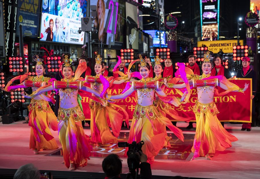 Actresses perform Chinese folk dance during the opening of the New Year celebration on Times Square in New York, the United States, on Dec. 31, 2019. (Xinhua/Wang Ying)