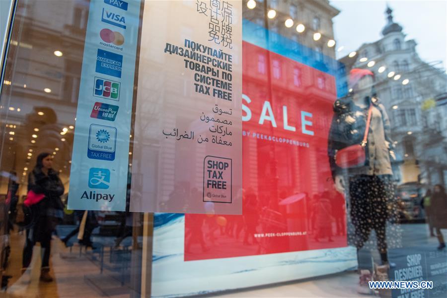 A sign supporting Alipay payment is displayed at Peek & Cloppenburg, a large clothing department store chain in Vienna, Austria, on Jan. 9, 2020. China's mobile payment company Alipay started its business in Vienna in 2018. After two years' development, payments with Alipay have been available in many stores in Vienna, allowing the increasing number of Chinese visitors to use the mobile payment here. (Xinhua/Guo Chen)