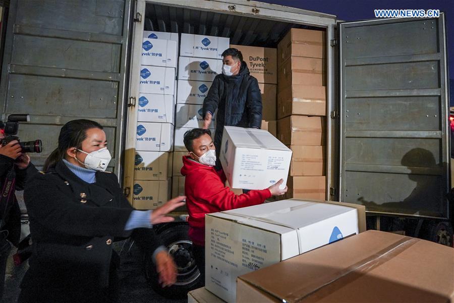 Staff members carry medical supplies to be transported to Wuhan in Nanjing, east China's Jiangsu Province, Jan. 25, 2020. The first group of 147 medical staff of Jiangsu Province left for Wuhan, the center of the novel coronavirus (2019-nCoV) outbreak, to provide medical aid. (Xinhua/Li Bo)