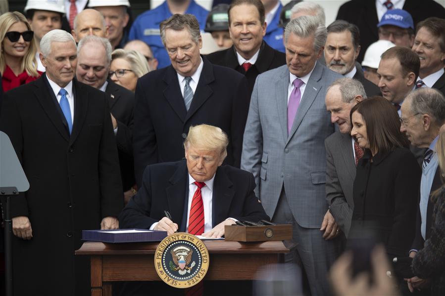 U.S. President Donald Trump signs the United States-Mexico-Canada Agreement (USMCA) at the White House in Washington D.C. Jan. 29, 2020. (Xinhua/Liu Jie)