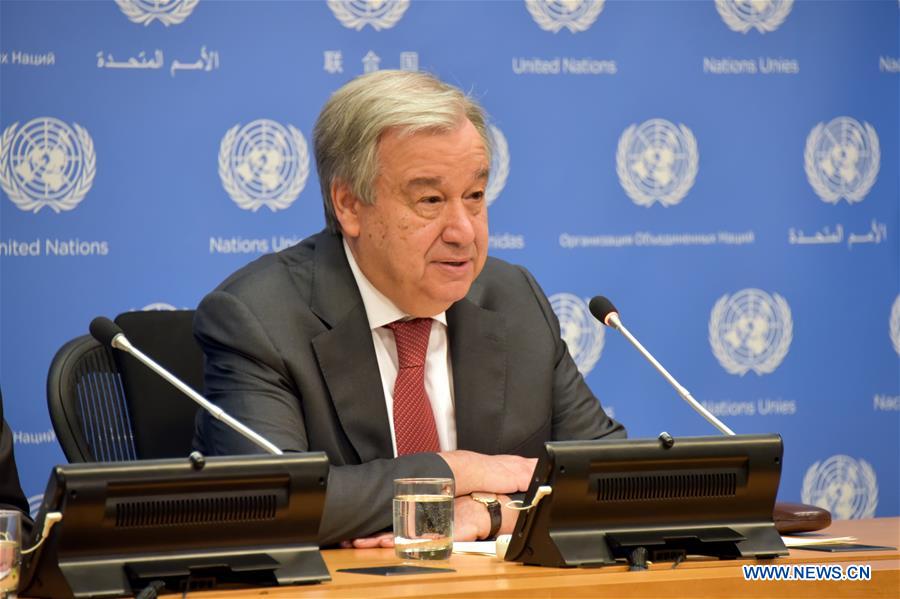United Nations Secretary-General Antonio Guterres speaks at a press conference on UN work priorities for 2020 at the UN headquarters in New York, on Feb. 4, 2020. Antonio Guterres said Tuesday that the organization is totally committed to the two-state solution to the Israeli-Palestinian conflict. (Xinhua/Wang Jiangang)