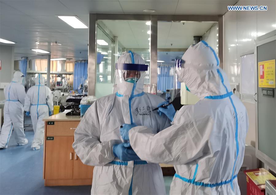 Photo taken with a mobile phone on Feb. 5, 2020 shows a doctor writting the name on the protective suit for Peng Zhiyong (L, front), the director of the intensive care unit, at an isolation ward in Zhongnan Hospital of Wuhan University in Wuhan, central China's Hubei Province. Health workers write names on their protective suits for each other for the sake of recognition in the isolation wards. (Photo by Zhong Nanxuan/Xinhua)