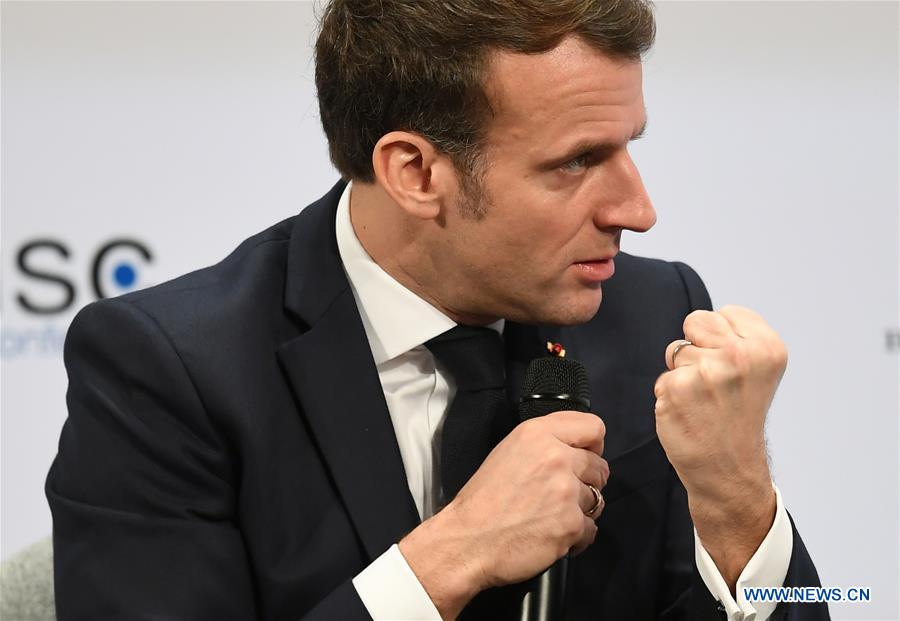 French President Emmanuel Macron speaks at the 56th Munich Security Conference (MSC) in Munich, Germany, Feb. 15, 2020. Macron on Saturday called for a European strategy and more actions at the European level in the face of challenges at the ongoing 56th MSC. (Xinhua/Lu Yang)
