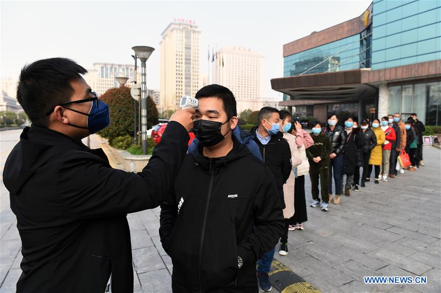 Employees from the Empark Grand Hotel of Anhui receive body temperature check before taking a bus to the Haier industrial park in Hefei, east China's Anhui Province, March 4, 2020. The third batch of 33 employees from the Empark Grand Hotel of Anhui began to work temporarily at the Haier industrial park Wednesday benefiting from an employee sharing program. The program adopted by the two enterprises has helped to solve the understaffed problem for Haier due to the outbreak of COVID-19. These employees would work on auxiliary posts after necessary trainings. (Photo by Zhou Mu/Xinhua)