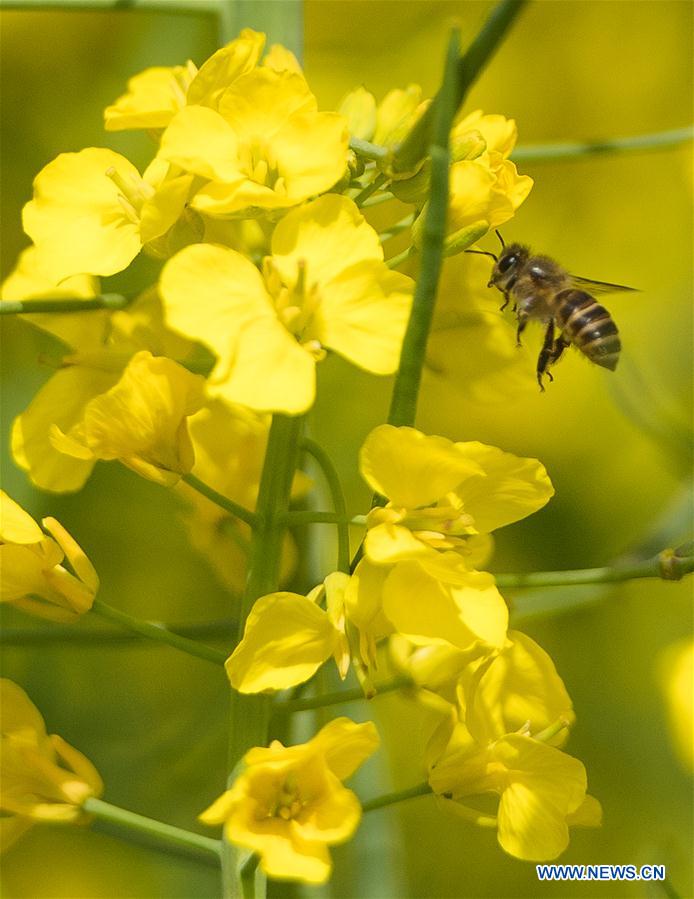 A bee sucks nectar from cole flowers in Wuhan, central China's Hubei Province, March 14, 2020. (Xinhua/Xiao Yijiu)