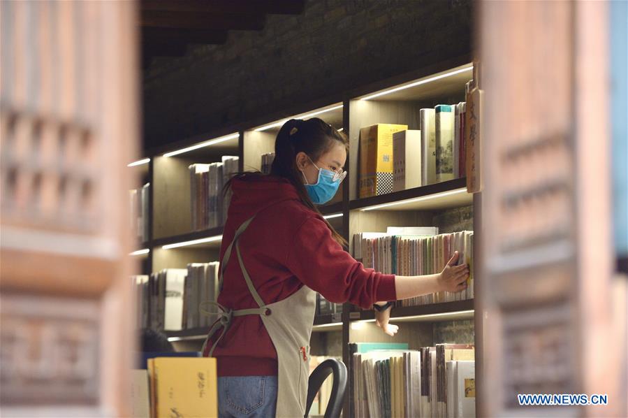 A staff member organizes a bookshelf at Lijiang Bookstore in Nanning, capital of south China's Guangxi Zhuang Autonomous Region, March 15, 2020. Many bookstores in Nanning have gradually resumed operation amid the fight against the novel coronavirus outbreak. (Xinhua/Cui Bowen)
