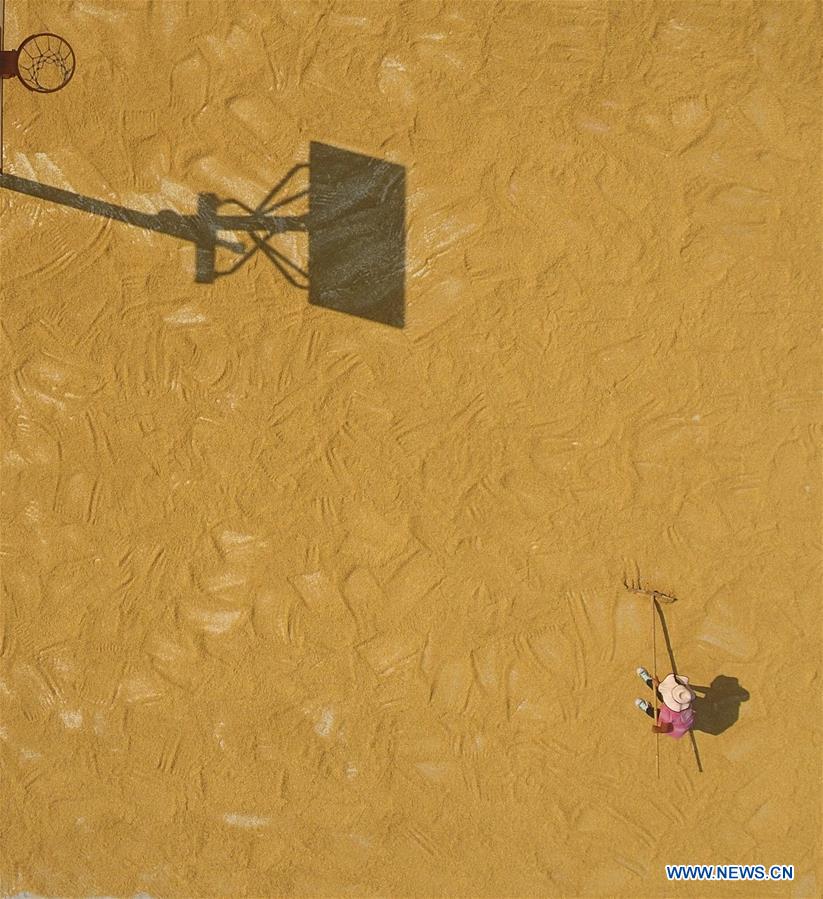 A farmer dries grains in the sun at Qinglong Village of Longtan Town in Huayuan County, central China's Hunan Province, Aug. 25, 2018. (Xinhua/Long Enze)