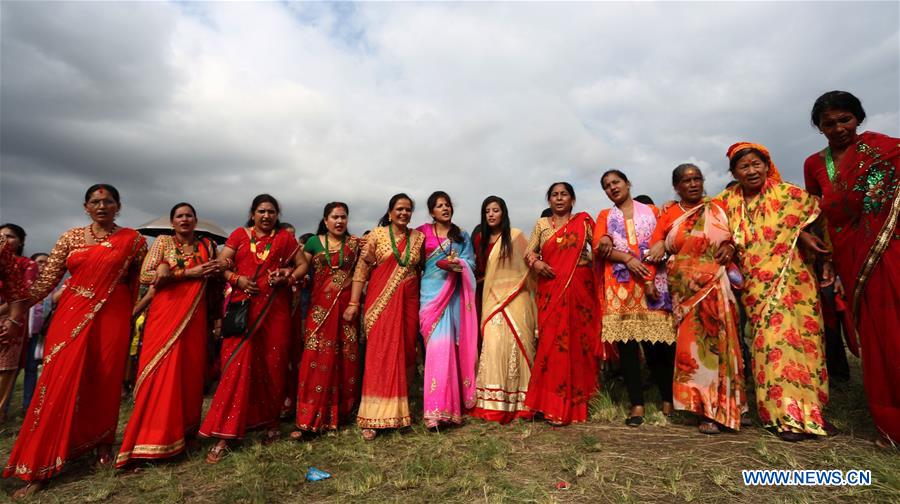 Women from far western Nepal perform a dance during the celebration of Gaura festival at Tundikhel in Kathmandu, Nepal, Sept. 3, 2018. The Gaura festival is mostly celebrated by people of far western part of Nepal where Goddess Gauri is worshipped for long and healthy life of their husbands. (Xinhua/Sunil Sharma)