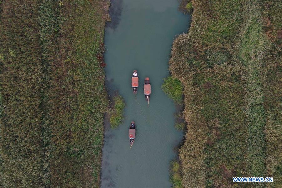 Aerial photo taken on Nov. 3, 2019 shows visitors taking sightseeing boats enjoying reed flowers in the Xixi National Wetland Park in Hangzhou, east China's Zhejiang Province. It is the best time to view reed flowers in the Xixi National Wetland Park in late autumn. (Xinhua/Huang Zongzhi)