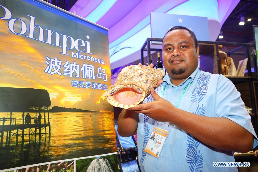 A staff member promotes tourism of Micronesia at the booth of the Pacific Island Countries at the first China International Import Expo (CIIE) in Shanghai, east China, Nov. 6, 2018. A total of 82 countries and three international organizations showcased their achievements in economic and trade development as well as competitive products at 71 booths in the Country Pavilion for Trade and Investment at the CIIE. (Xinhua/Liu Dawei)