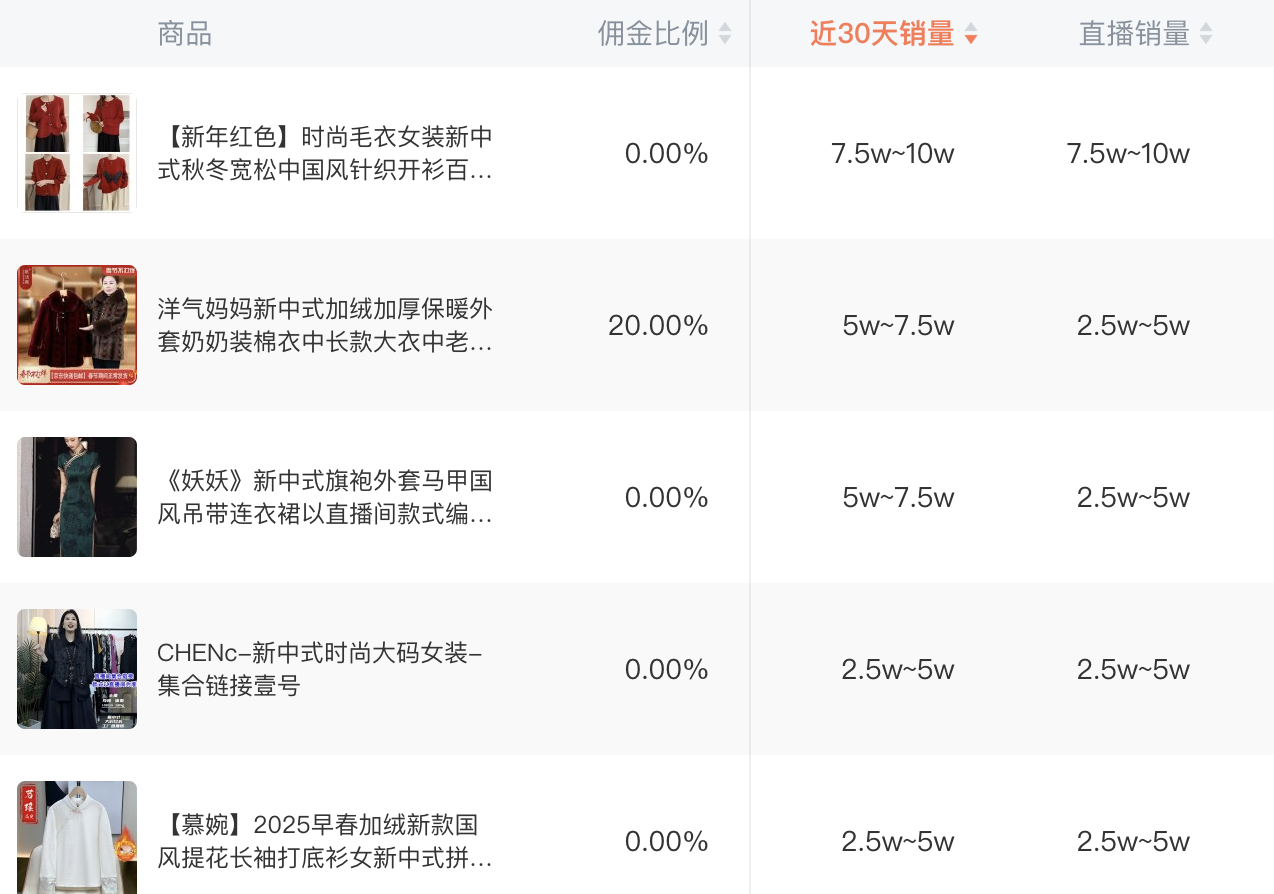與此同時,線上平臺,新中式也呈現出巨大的消費力。據直播電商數據分析平臺蟬媽媽顯示,截至2月4日,近30天內新中式服飾類商品銷量排行中,一款中國風針織開衫銷量超過7.5萬件,排名前五的產品,直播銷售都在2.5萬件以上。