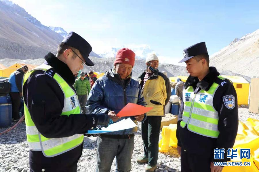 在珠峰大本營執勤點,民警開展普法宣傳(2月攝)。新華社發(鄭勁松 攝)