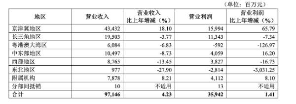 作為全國性股份制商業銀行,華夏銀行在各區域的發展狀況面臨著風險與挑戰。從區域經營數據來看,其發展情況出現顯著分化,該行總部所在的京津冀區域經營表現較好,2024年營業收入達434.32億元,占總收入44.7%,比上年增加18.1%;營業利潤高達159.94億元,比上年增加65.79%,其他多個區域經營表現一般,呈現下滑態勢。