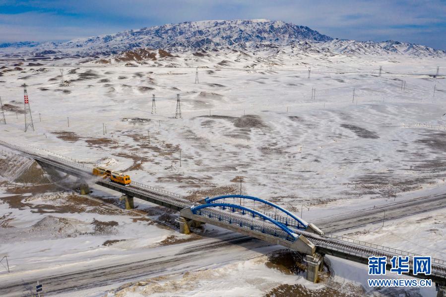 軌道除雪車在瑪依塔斯風區克塔鐵路沿線進行清雪作業(1月21日攝,無人機照片)。新華社記者 胡虎虎 攝