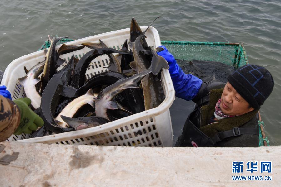 在伊河鱘業科技股份有限公司養殖基地,工人在捕撈鱘魚(2月7日攝)。