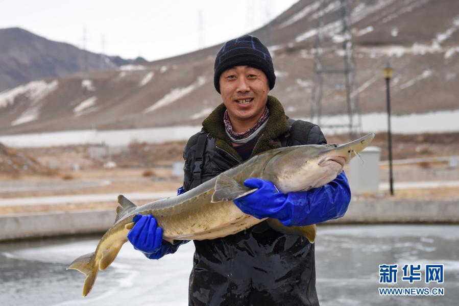 在伊河鱘業科技股份有限公司養殖基地,工人展示剛捕撈的鱘魚(2月7日攝)。