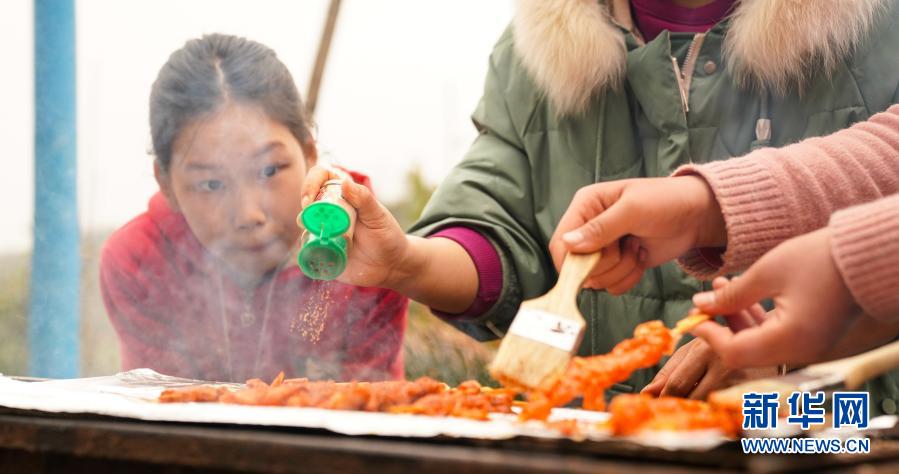 2月3日,竹亭鎮中心小學4年級學生李玉春在看大家烤肉。新華社記者 胡晨歡 攝