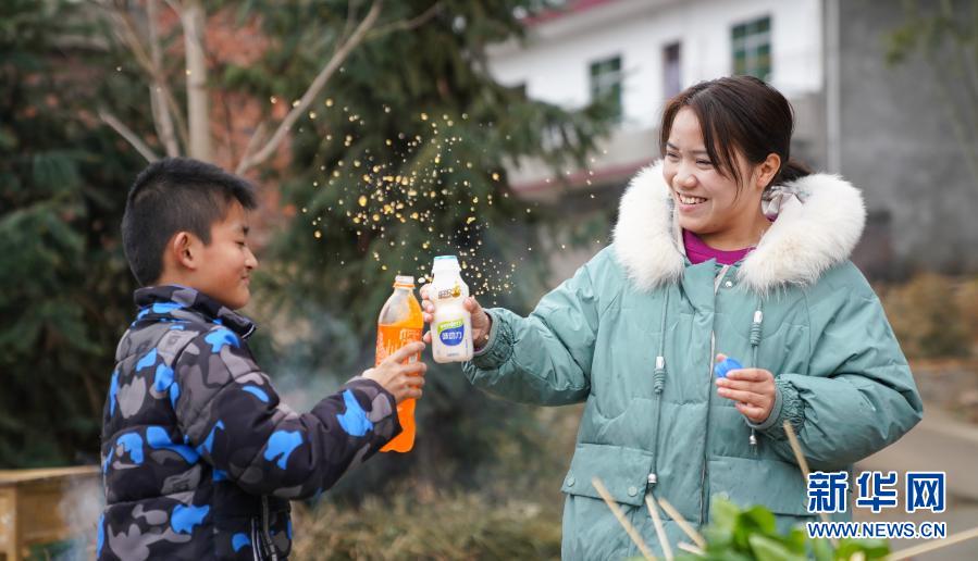 2月3日,王翩(右)和學生林玉健用汽水和酸奶互祝新春。新華社記者 胡晨歡 攝
