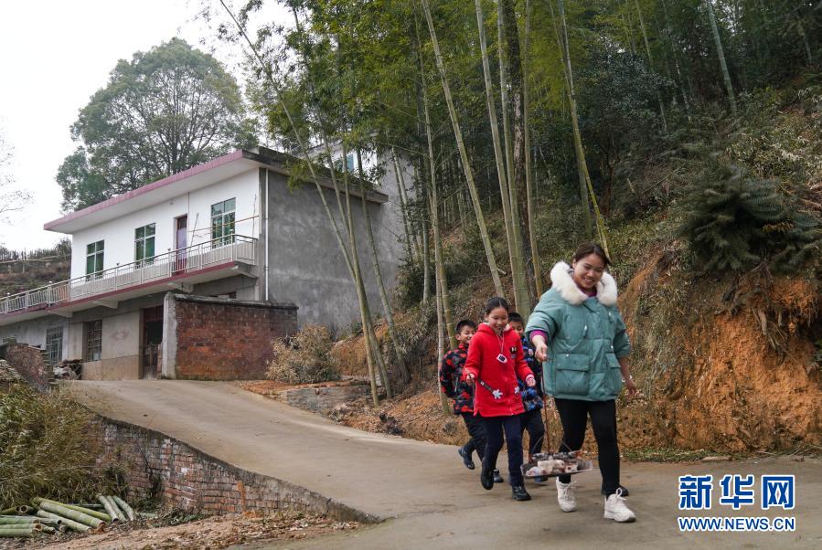 2月3日,王翩(右一)和孩子提著炭火走向燒烤點。新華社記者 胡晨歡 攝