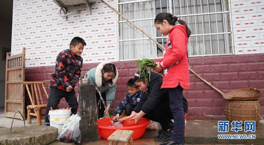 2月3日,王翩(左二)和孩子一起清洗燒烤用的食材。新華社記者 胡晨歡 攝
