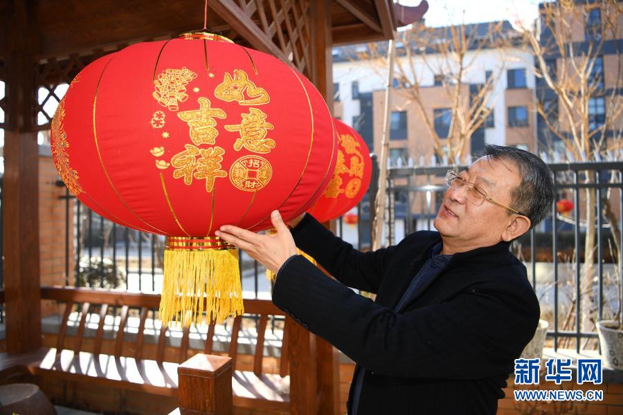 陳志昊的父親陳國謙在山東泰安的老家中掛紅燈籠(2月8日攝)。