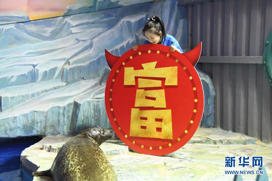 在哈爾濱極地館,馴養師蔣蕊和海豹互動(2月8日攝)。新華社發