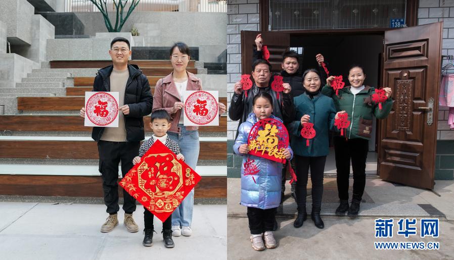 這是一張拼版的“全家?!闭掌?。左圖為楊夏坤(左)、妻子楊亞慧(右)和兒子楊景淳(中)在上海某建筑工地內的合影(2月9日,新華社記者丁汀攝);右圖為楊夏坤的父親楊烈華(中排左一)、母親徐杏枝(右二)、姐姐楊漫(右一)、姐夫萬里(右三)以及外甥女徐溪陽在湖北武漢家中的合影(2月8日,新華社記者肖藝九攝)。