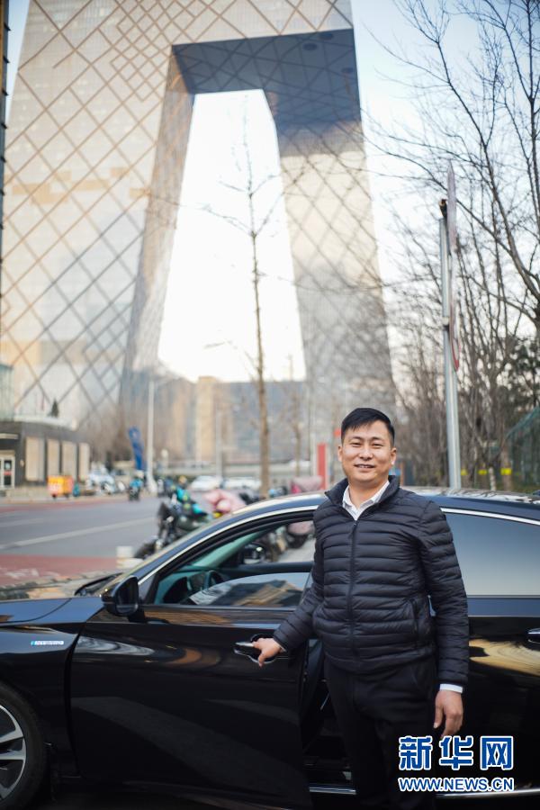 老家在湖北孝感的滴滴專車司機魏闖來在北京國貿附近(2月9日攝)。今年,他選擇和妻子、孩子在京過年。