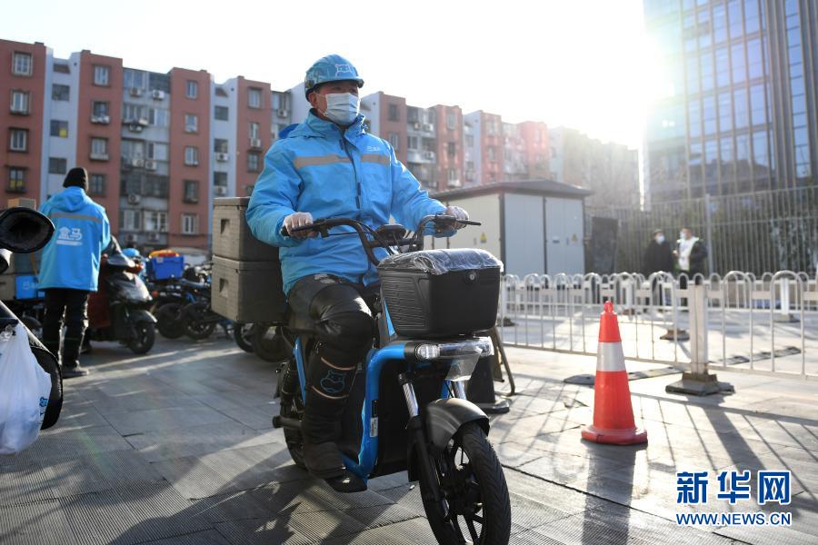 盒馬鮮生棗園店配送員劉樹才出發配送(2月5日攝)。劉樹才,41歲,來自黑龍江省五常市,來到北京已經有10年。2020年3月,劉樹才加入盒馬鮮生成為一名配送員,負責門店附近3公里以內的貨物配送,日均配送約60單。今年過年,他選擇和妻子孩子一起留在北京過年,“老家七十多歲的父母都很支持我的工作,今年過年不能回家,我尋思跟爸媽說一句,讓他倆在家別舍不得花錢,多買點好吃的?!眲洳耪f。