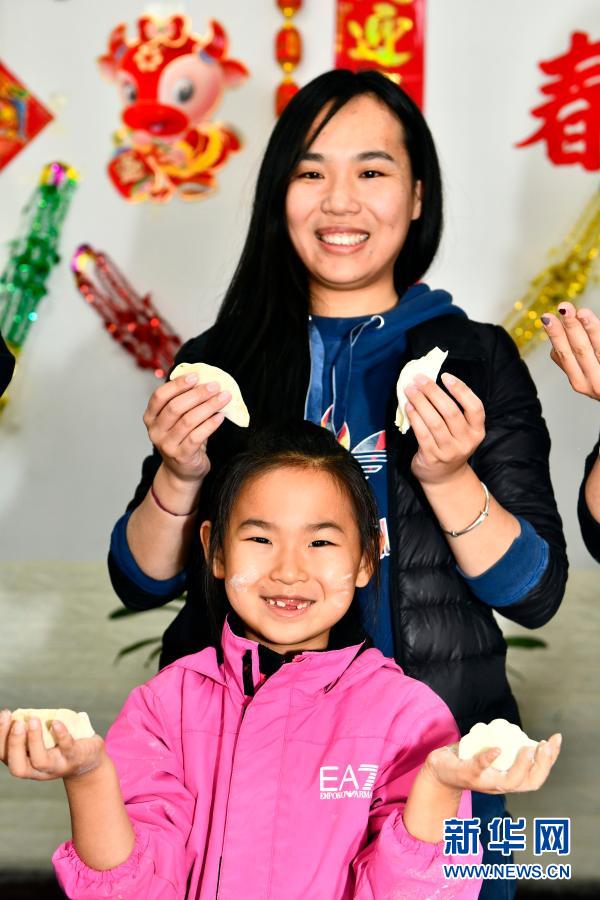 2月10日,在濟(南)萊(蕪)高鐵中鐵十局一工區,一名就地過年的職工和女兒在展示自己包的水餃。