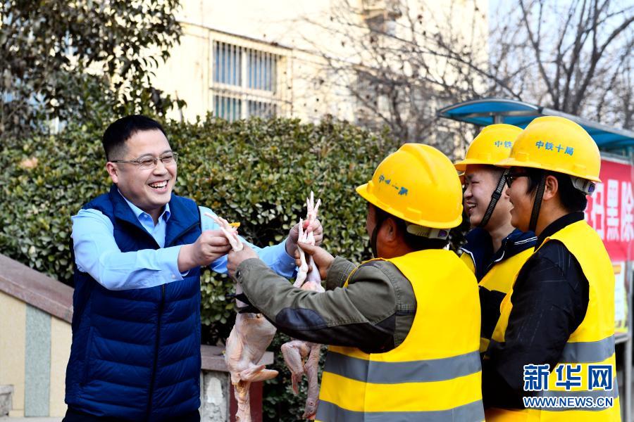 2月10日,在濟(南)萊(蕪)高鐵中鐵十局一工區,項目部工作人員為就地過年的外來務工人員送上慰問品。