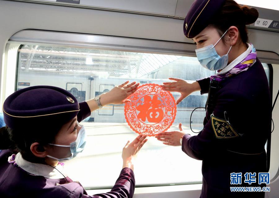 2月10日,G1347次高鐵列車的乘務員在列車上貼窗花。