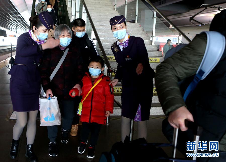 2月10日,G1347次高鐵列車的乘務員在上海虹橋火車站協助旅客上車。
