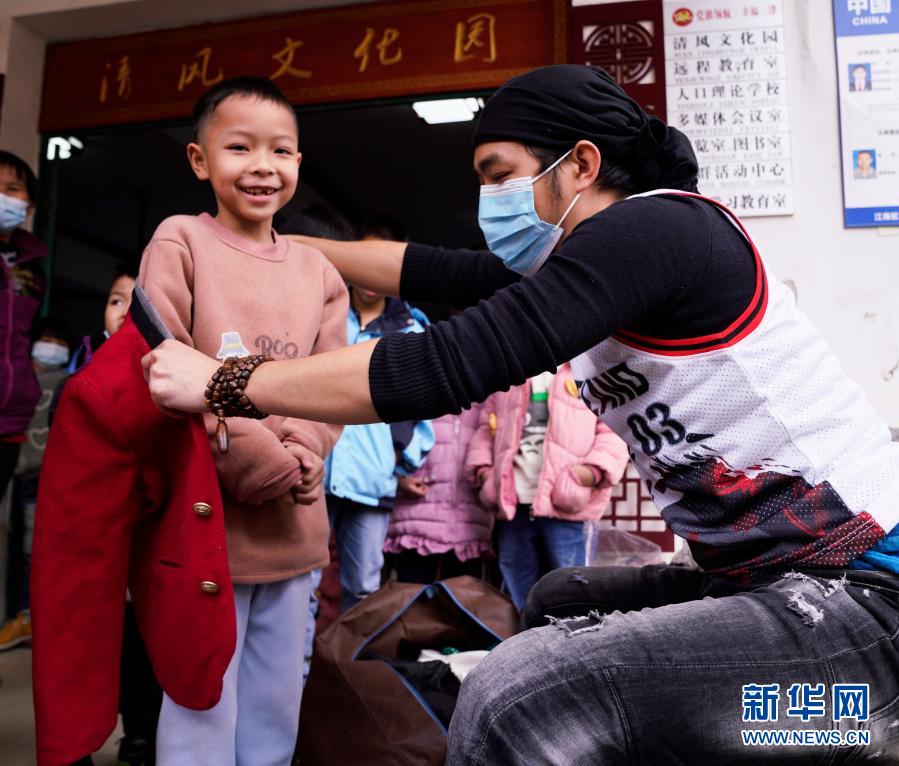 在南寧市江南區三津村,劉佳幫孩子試穿愛心人士捐贈的衣服(2月9日攝)。新華社記者 楊馳 攝
