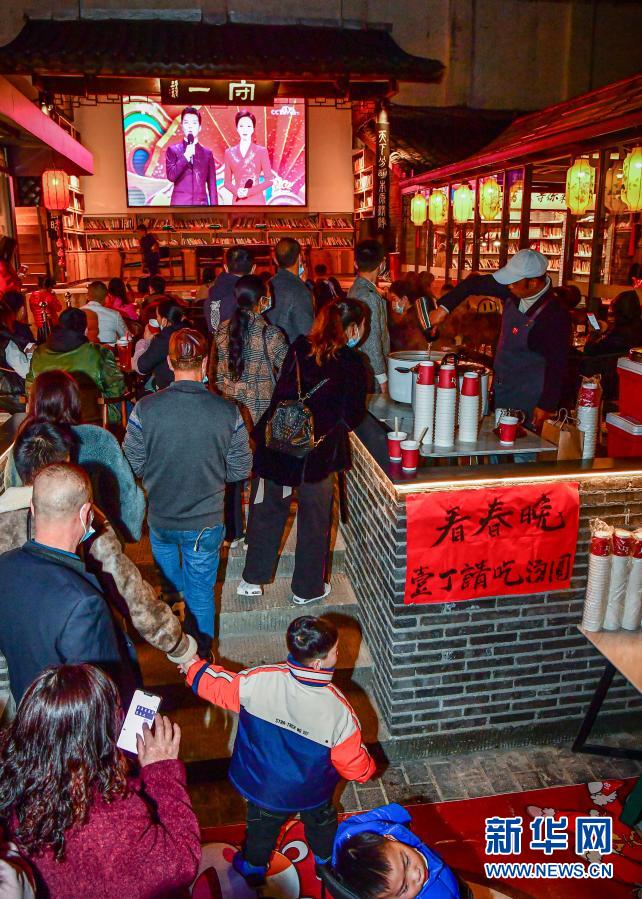 除夕夜,成都寬窄巷子景區內的壹丁24小時書吧咖啡館響應“就地過年”倡議,推出“來寬窄吃團圓飯看春晚”活動。上百名市民、游客圍坐在古樸的寬窄巷子院壩里,享受露天看春節聯歡晚會的樂趣。壹丁24小時書吧咖啡館的創始人還準備了餃子、湯圓請游客免費品嘗,成為一道別樣的年夜飯。